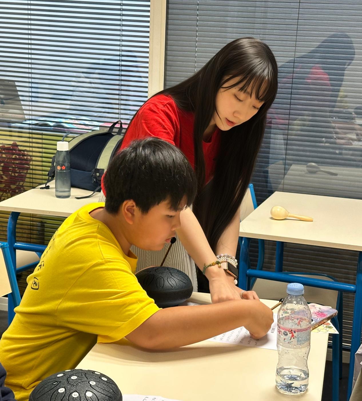 陶笛和空灵鼓两门乐器课程,让小营员们体验到了中华传统音乐的韵律之美。陶笛课上,田路老师先教孩子们认识陶笛的音孔,再从简单的音阶练起,当《小星星》的旋律从孩子们手中的陶笛响起时,课堂上瞬间充满了欢乐的气氛;空灵鼓课程中,方青羽老师引导孩子们用鼓槌轻轻敲击鼓面,感受不同音区的音色差异,孩子们跟着节奏敲击,清脆悦耳的鼓声此起彼伏,不少孩子还发挥创意,尝试组合出自己喜欢的节奏。