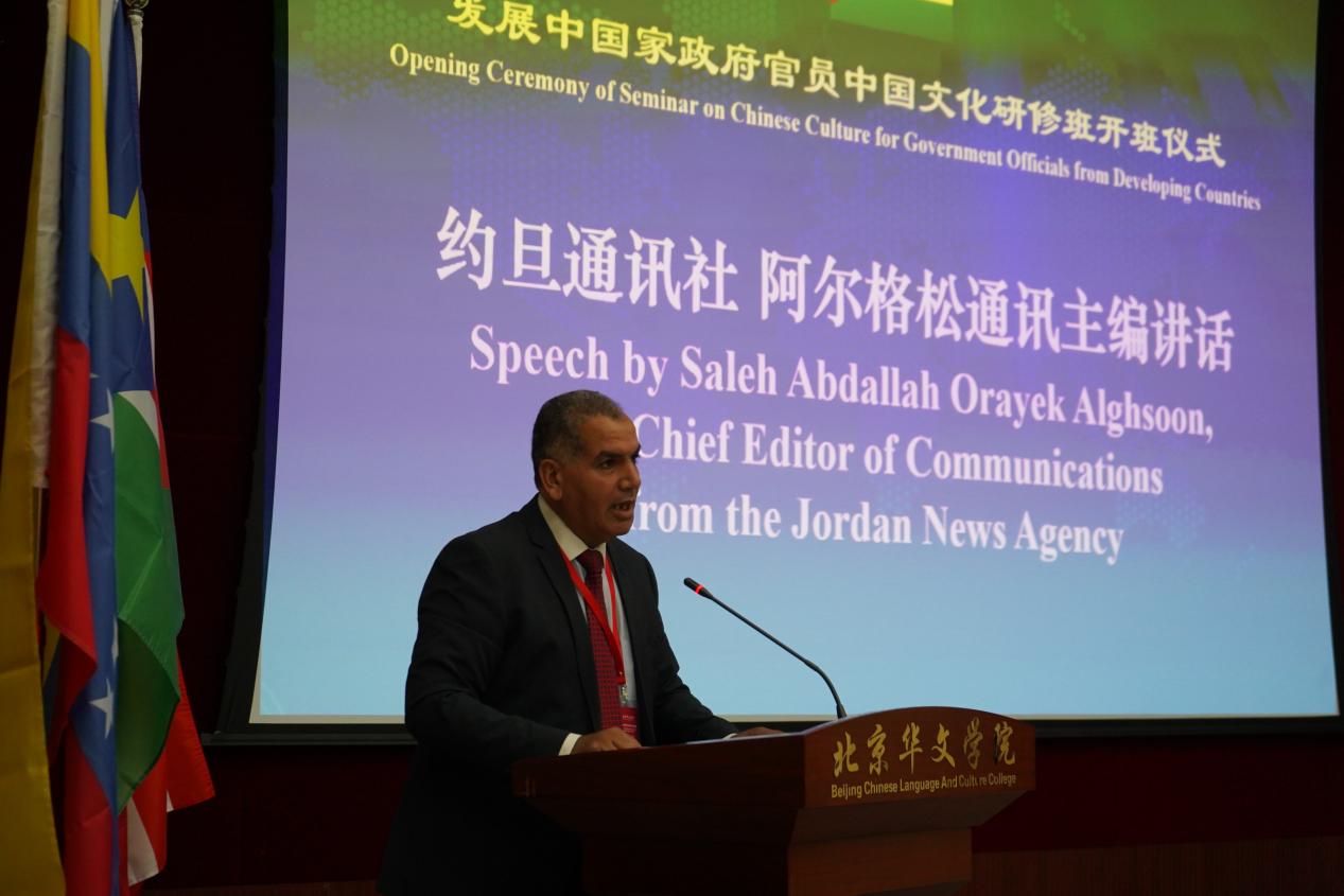 来自约旦通讯社的阿尔格松主编作为学员代表发言。他非常赞赏习近平主席提出的“一带一路”倡议,为沿线国家文明交流搭建了广阔平台。感谢中国在国际事务中一贯坚持的原则立场,为国际社会树立了道义与良知的典范。他表示,这次研修是深入了解中国文化的宝贵机会,希望今后能进一步加强中约之间的合作交流。