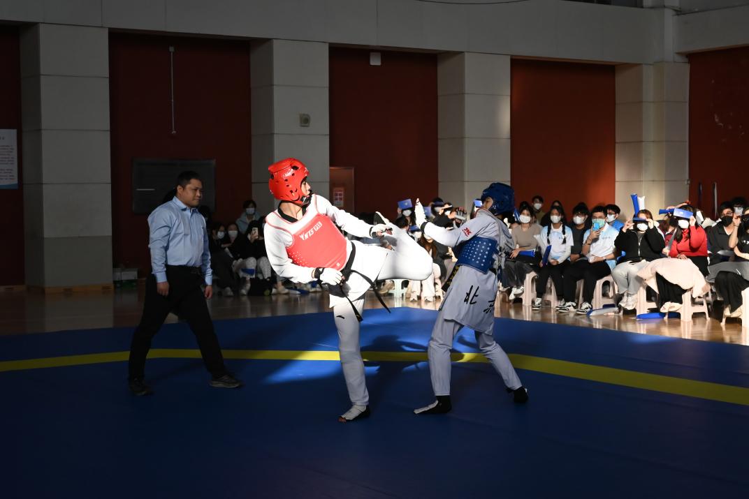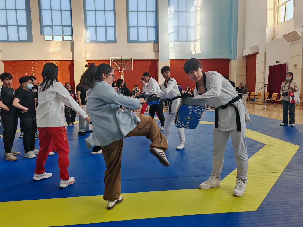 活动现场,学院武术队率先登台,以一套行云流水般的表演展现中华传统武术的深厚底蕴。随后,现役跆拳道运动员带来的实战对抗展示将气氛推向高潮,国家级裁判专业执裁,世界冠军詹天瑞同步解说,每一次进攻防守都扣人心弦,紧张激烈的比赛赢得观众阵阵掌声。