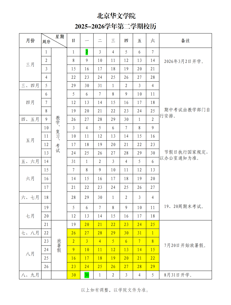 2025-2026学年第二学期校历